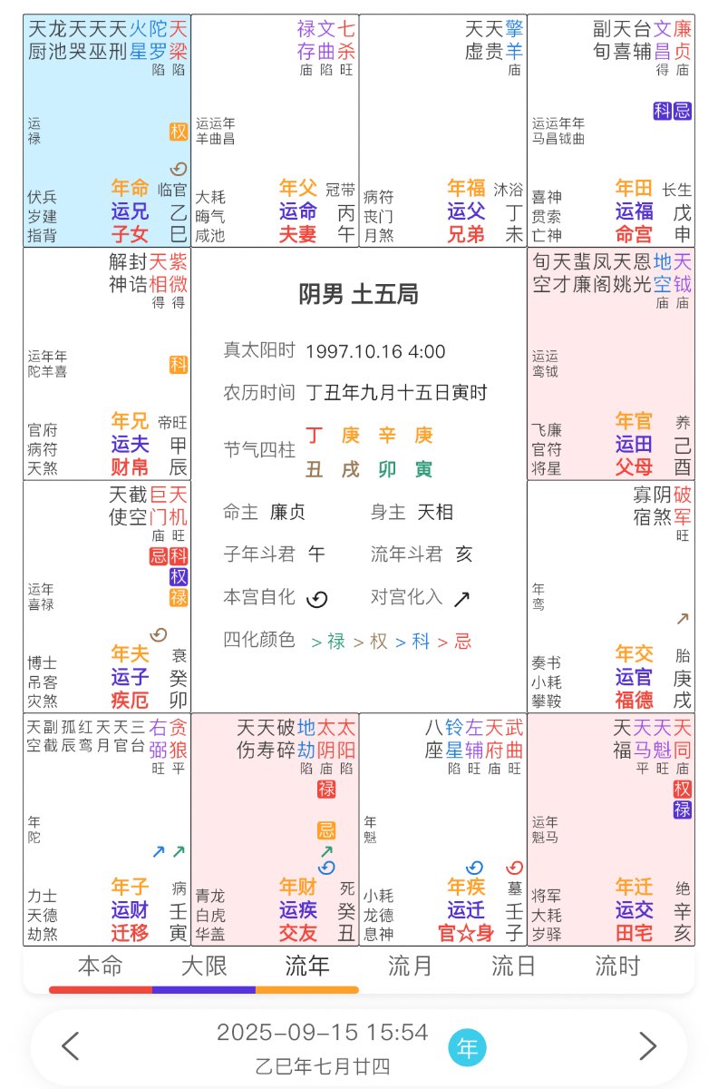 请大家看看我的感情,截图是2025年的流盘。我想知道什么时候会有感情?本人也稍微懂一点紫薇,希望来看盘的朋友能稍加解释。最佳答案一定从带解释的答案里挑选